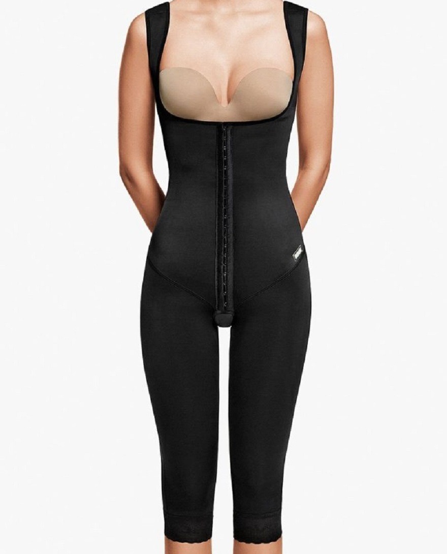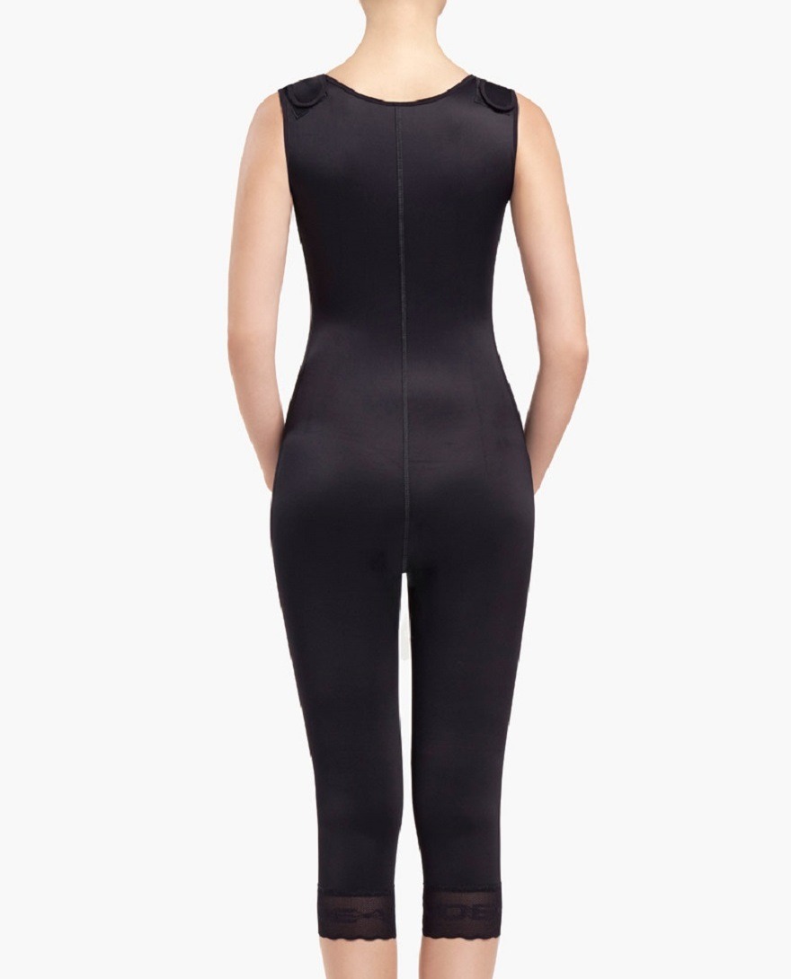 High waist compression girdle below the knee and with extended back designed to compress and sculpt the abdomen, flanks, back and legs.