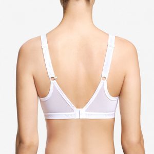 Wire free, front fastening with 3 hook and eye rows plus a back closure. Straps are adjustable with the option to cross them at the back.